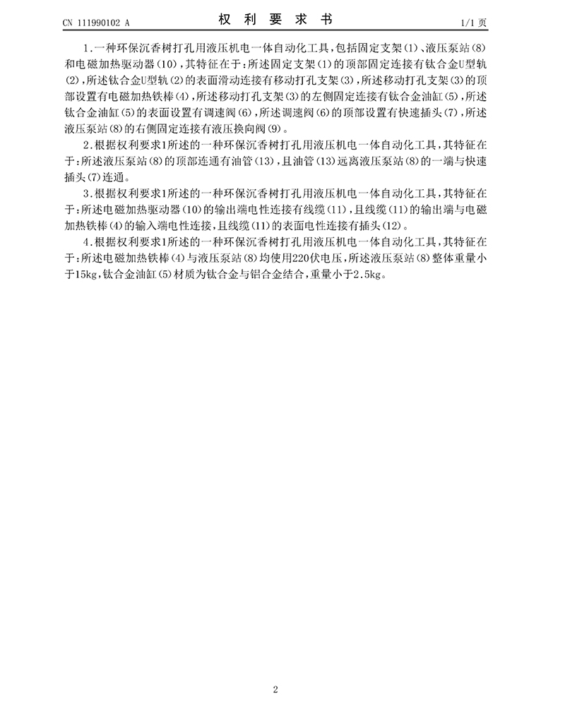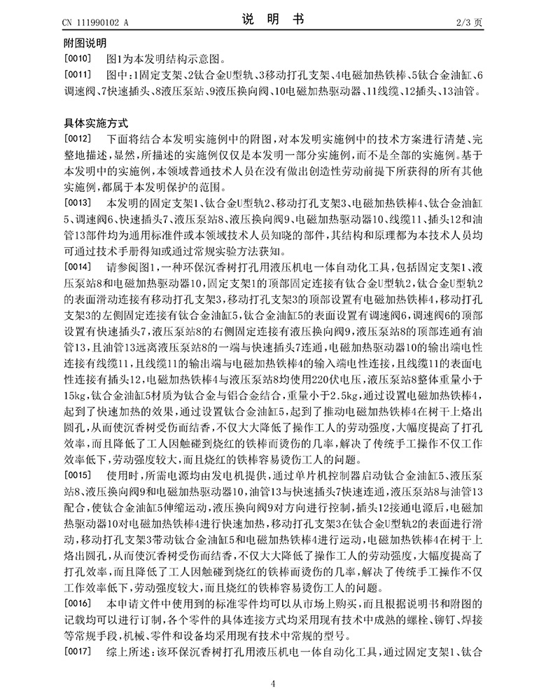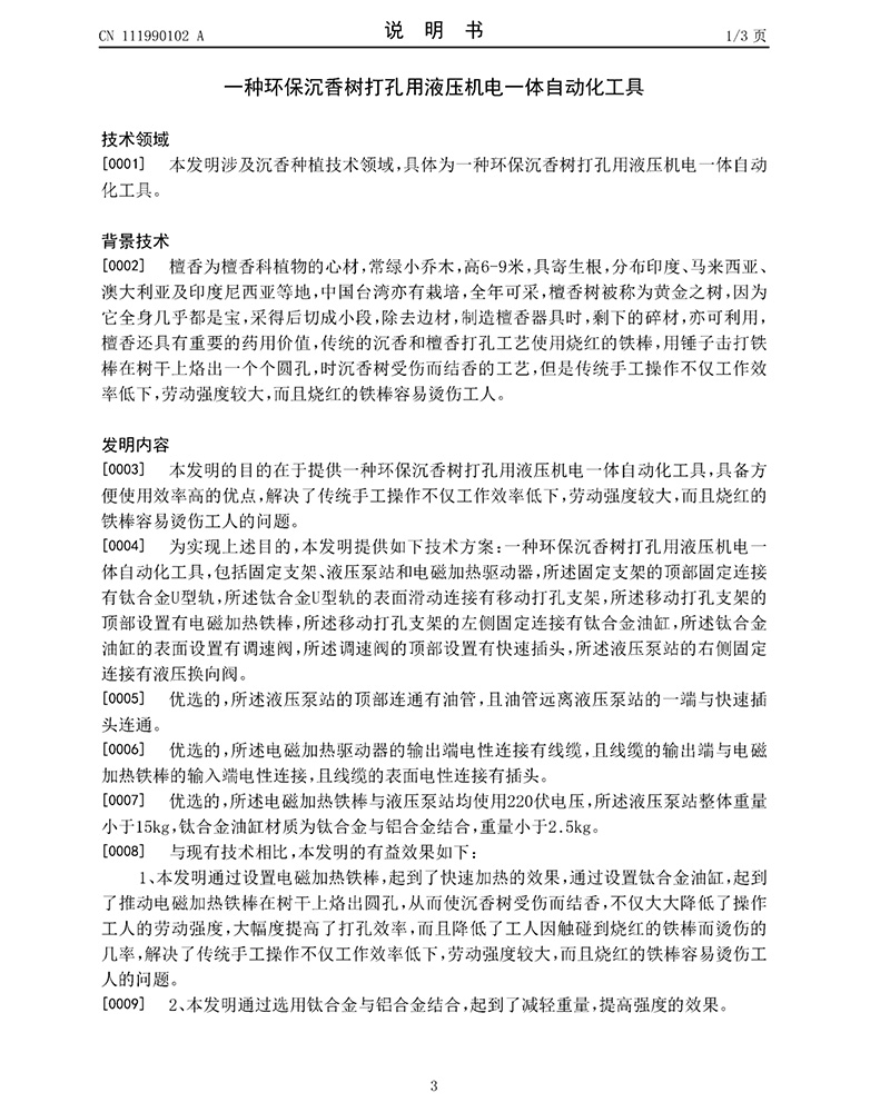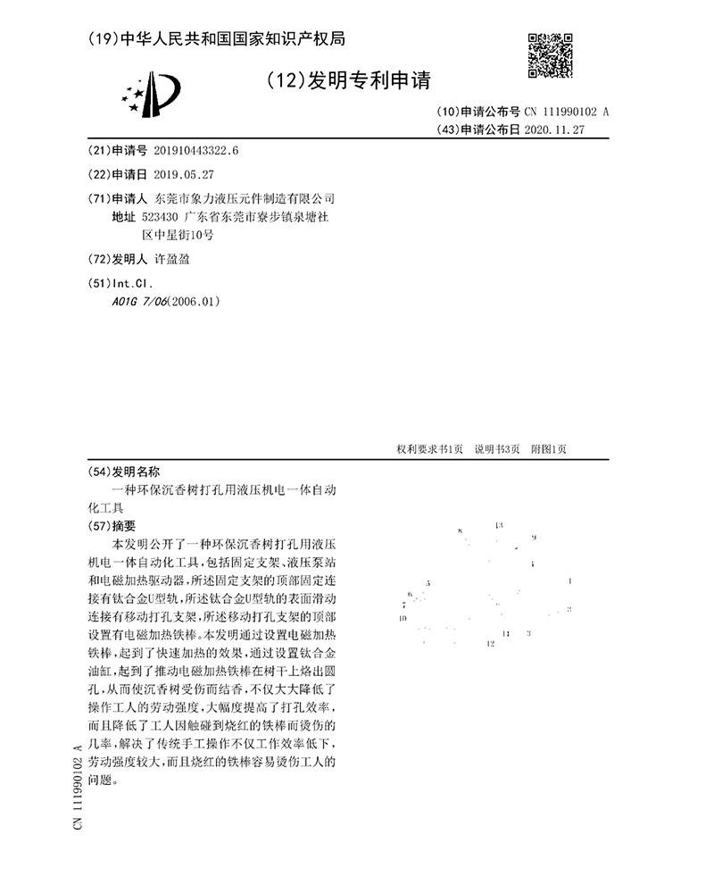 发明专利证书 一种环保沉香树打孔用液压机电一体自动化工具